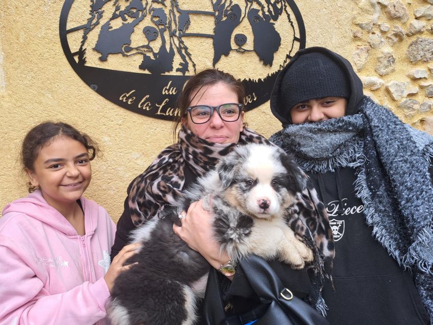 | Alika, miss bleu merle, née de Tessa et Tucker, le 16.09.25, vient de partir avec Sabrina, et deux de ses enfants, pour La region de Royan, pour une vie de famille, calins, plage .. mais je laisse Sabrina qui va nous rejoindre nous en dire plus ..